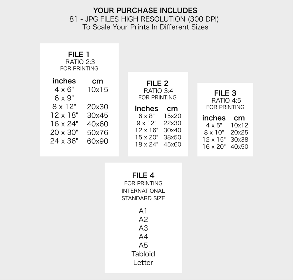 This purchase includes 81 high-resolution JPG files, following the sizes listed below.