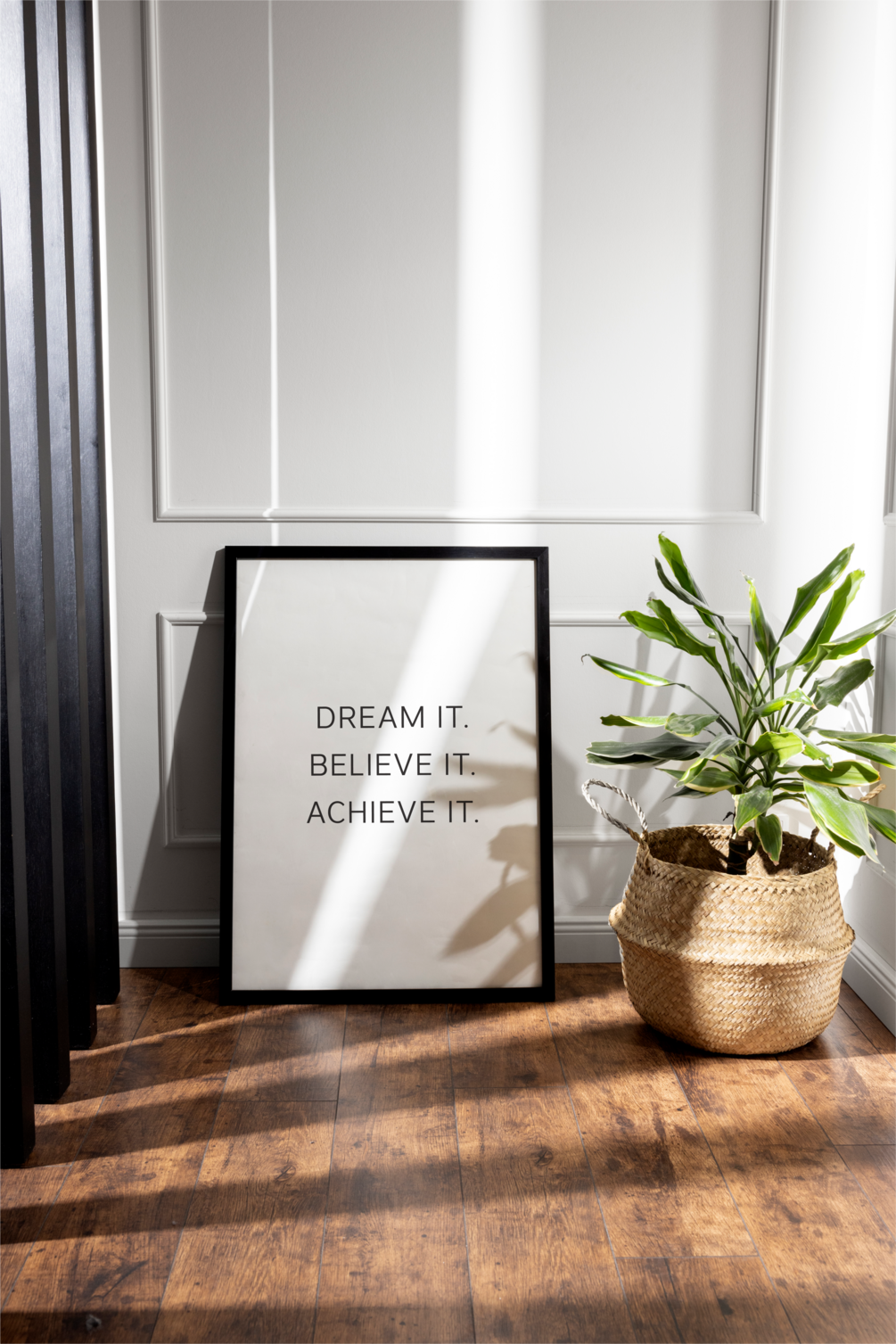This digital art has a simple design and a positive quote. It's great for making your home, office, or classroom feel better. You can download it easily and it's perfect for making wall art or posters. It's a nice gift for your mom, sister, coworker, or friend, and it's good for inspiring people in classrooms too. The quote "Dream It. Believe It. Achieve It." is encouraging.