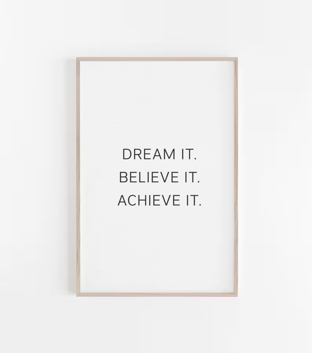 This digital art has a simple design and a positive quote. It's great for making your home, office, or classroom feel better. You can download it easily and it's perfect for making wall art or posters. It's a nice gift for your mom, sister, coworker, or friend, and it's good for inspiring people in classrooms too. The quote "Dream It. Believe It. Achieve It." is encouraging.